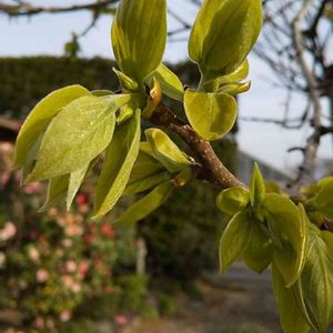 庭Bと庭Cの境にある甘しぶの柿の木。新芽が出てきました。 後ろにあるのは、GSに何回か登場した3本椿です。