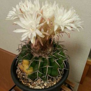 本日2枚目の「劇的Before After」はディスコカクタス・ホルスティーさんです🥰💕 上が園芸店さんの見事な株で、下が我家にお迎えしたちびっ子ちゃんです🌵✨ 濃い色の地肌に白い綿毛と棘座が本当に美しいサボテンさんで、お気に入りの子になりそう😍🎶 でも……ディスコカクタス属のサボテンさんは かなり寒さに弱くて、冬場も水やりするなら15℃〜20℃くらいを維持☝️ 断水しても5℃以上を維持しとかないと、春以降の成長が悪くなってしまうらしいです❄️💦 ホルスティーさんは…そんなディスコカクタス属の中でも わりと小型の品種で、直径5〜6cmくらいに育つと、柑橘系の香りのするお花を咲かせてくれるそう🌸✨ 我家にお迎えした子は直径4cmくらいだから、数年後にはお花が見られそうです( ´͈ ॢꇴ `͈ॢ)・*♡ 超美麗品種でお勧めなんだけど…… 自生地では絶滅の危機にあるらしく、ワシントン条約で学術研究目的以外の輸出入が❌らしいんですよね(;^_^A💦 だから、そういう研究目的で国内に入って来た子が開花して、その種から実生して、園芸品種として販売……ってことになるんだろうから、市場にあんまり出回らないみたい😓 (子株も多少できるのかもしれませんが、子吹きが良いという情報は見かけませんし💦) 私も今回小株ちゃんを見つけられて、ラッキーだったと喜んでいます🤗✌️ 枯らさずに上手に冬越しできますように……🙏💦❄️