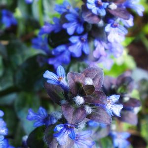 庭のあちこちの小さな青が 見て見てと手を振ってます。 ①アジュガ。 今年は自生のキランソウが少なくなって ちょっと寂しいのです。 ②③タツナミソウ。 ④⑤黒花タマシャジン。 硬質な感じが💙