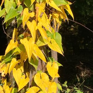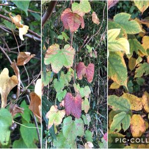 秋色をいろいろ。 ↖️山芋のムカゴ、もう少し量が有ればムカゴご飯にしたいですが😅 ⬅️野葡萄っぽい葉だけど、細い蔓だから違いますね… 紅葉狩に行くことなく、小さな秋色に癒されています🍁