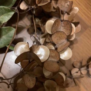2階ベランダに誘引したヤマノイモ、こんな感じになってます。茶色くなった種は子どものころ鼻に貼り付けてたりして遊んだ方も多いのでは?意外に紅葉した葉の黄色が美しく、鮮やかです。