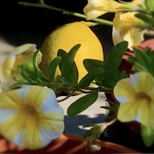 🍋レモンとレモンスライス🍋 我が家に来て2年、初めてレモンがなりました❗️1個。このたった1個をどうやって利用したら1番良いのか?悩みますね〜🤔 そしてレモンとレモンスライスちゃんのコラボ✨✨ レモンが黄色くなるまでレモンスライスちゃんが持つか心配していましたが、なんとか💦 さすがに鮮やかな黄色が抜けてきて、色が薄くなってきました。もうおしまいかな?コラボ写真が撮れたので剪定します😊