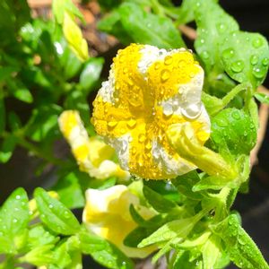 水撒き後のスーパーベルレモンスライス🌼 花びらが滴の器になり冷んやり涼しそう。