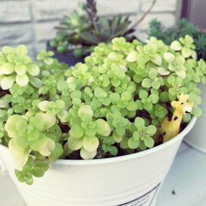 寄植え…やっぱりセンスないみたい😩 緑色ばっか💦 手前のカリフォルニアサンセット、ネットで注文して届いた時は鮮やかな緑で凄く綺麗な色だったのに😥