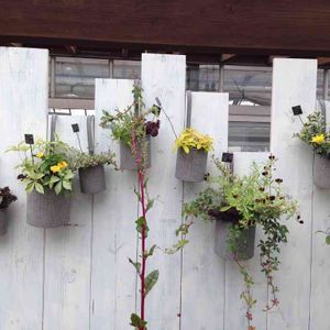 ブリキの器に花色を統一させた小さな寄せ植えを、壁面にリズムをつけて飾ったもの。 結構お気に入りの企みでありました(*^^*) 数年前のルーシーグレイにて。