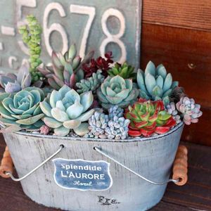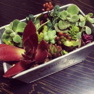 大きなブリキ鉢の寄せ植え。 外側をぐるっとセダムで囲みました♡ 真ん中のエケは名無しちゃんだったのですが…名前わかる方教えて頂けると嬉しいです('-'*)