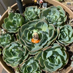 こんにちわ〜☺️ 今日も風が気持ちいいよ〜🎶 我が家の七福神サマも気持ちよさそう🎶 先日KOHちゃんの七福神companyの仲間に入れて頂きました💖 No.80です😊どうぞよろしくお願いします〜すヾ(๑⃙⃘´ꇴ`๑⃙⃘)ノ♥️ 我が家の七福神サマはね なんだか葉っぱの形がブチャイクなの😅 縦長くて爪の形もおかしい💦 水のやりすぎが原因なのかしら? この前まで花芽が沢山あってカット✂️ KOHちゃんの投稿で花芽を挿しておいたら お子ちゃまが生まれたとあったので… 私もチャレンジ🎶 周りにぶっ挿してみましたよ(∩´∀`∩)♡ 福の神コポたんに見守ってもらいます💖