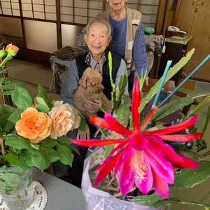 94歳の父は今朝咲いてたクジャクサボテンの花に感動して記念写真を撮ってと。