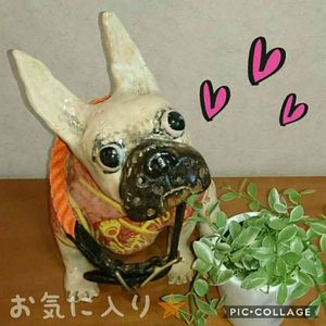 😃🌃 今日も1日お疲れさまでした。 最近、お庭に変化もなく同じような🌹で…upするものなく😅 で、 先日、以前より欲しくて欲しくて我慢してた😞 ディスキディアエメラルドの 小さくてお手頃価格🍃を見つけお連れしました。😃💓 今、わが家の玄関は、お気に入り🌟コラボで癒し空間になっています。🎶 置物🐶は思い出になってしまった🏠の愛犬です。💕 陶芸サークルの息子作です。💓