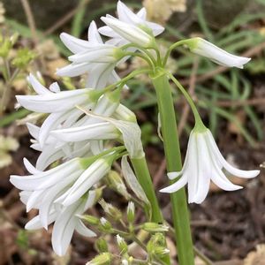【ミツカドネギ(三角葱、アリウム・トリケトラム)】 ヨーロッパ原産、ヒガンバナ科多年草 帰化植物で、川岸などのやや湿った土地に生える。 花茎の断面は三角形で、先端に白色の花を4~19個つける。 花は6枚の花弁があり、白色に緑色の筋の入った鐘状。 全体に独特の香りがあり、ネギやニラの仲間で食用になる。 草丈:200〜600mm 花期:4月~5月 花色:白 白野江植物公園@北九州市