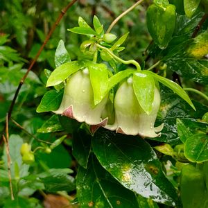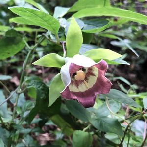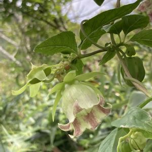 ツルニンジン 別名 ジイソブ 🌱キキョウ科 ツルニンジン属 ✽茎は他の物に絡みついて伸びる長さ2〜3mのつる性の多年草 ✽茎は切ると白い乳液が出、人参状の根を持つ ✽葉は短い枝に輪生状につき、両端がとがった楕円形で 裏面は白っぽい ✽花は長さ3cmほどの鐘形で内側に紫褐色の斑があり、大きながく裂片に包まれて異臭がする 霧雨で森の中はしっとりしていて、気持ち良かった〜☂️ ③↙️別日、別場所の花は色白あっさりさんです!