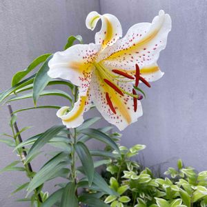 ユリ おはようございます お隣さんとの境に屋根まで届くほど伸びたユリが咲いています