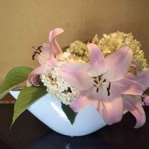 おはようございます😊✨。 先日投稿のお花、 器を替えて入れ替えました。 元気なゆりとアナベル、 田植え花の葉っぱと ニンジンの花が少し…。 ゆりの雄しべには ハードタイプのヘアスプレーを掛けました(^-^)。 (花粉が散りません✨)。 今日も素敵な1日に なりますように✨✨✨✨💖。