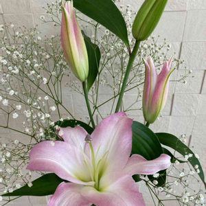 おはようございます🤗 ユリ&アルストロメリア 二週間前に購入しました その時はユリは全部が蕾でした やっと開花しました🍀 全部で30円の激安です😅