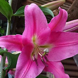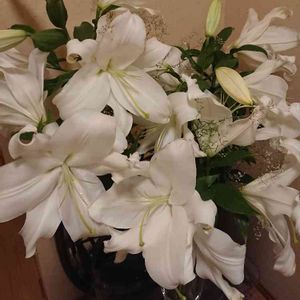 オリエンタル 百合 ロビーナちゃん🥰 玄関開けたら、さいてました。 1つの、球根から、2本の、芽が出て、お花ちゃんは! 25個あります。😍😍😍 嬉しいです。綺麗な時に、見て頂きたく、投稿させていただきました。 ありがとうございました。 酷い災害が、これ以上 おきませんように。