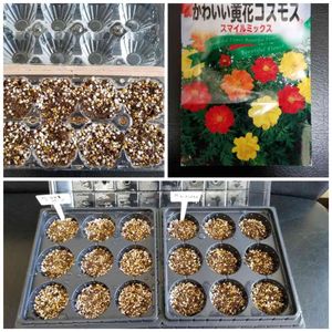 おはようございます。 花壇に、直蒔きする予定が 空きスペースが、なくて、とりあえず、種蒔きハウスに、蒔きました。 百日草クイーン(ジニア) 好光性種子 種が、隠れる程度に、薄く土を、かけます。 日当たり、水はけの良い場所が、適しています。 日光不足では、軟弱な苗に、育ってしまいます。 土質は、特に選びませんが 水はけ、水もちの良い土が、良いでしょう。 市販の培養土に、赤玉小粒7、腐葉土3、が、適当です。 水やり 土の表面が、乾いたらたっぷり、与える。 乾燥が、続き、水切れ状態が、続くと、花も小さくなり、株全体も、小さくなって、しまいます。 生育期は、1週間に、1回程度液肥を、与える。 草姿が、乱れたら、半分ほどのところで、切り戻しすると、再び整います。 観賞期間が、長いので、定期的に、株元に、追肥します。 キバナコスモス 6月17日の誕生日花で、 知り合いの孫娘さんの誕生日です。 それまでに、咲かせたいなあと、思い、 早めの種蒔きしました。 ギリギリ間に合うかな? 水切れに、注意しながら、管理します。 夜は、室内窓際で管理しています。