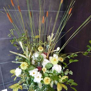 おはようございます。 いつもの歯医者さんのアレンジメントです🎵 グリーンと白がメインで、シックな感じです🎵