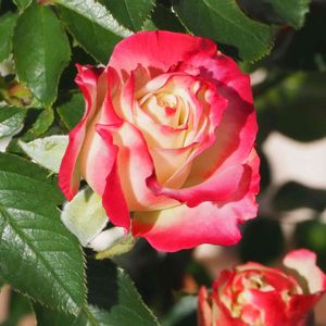 こんにちは〜♬ 🌹ジュビレ・デュ・プリンス・ドゥ・モナコ🇲🇨 開き始めから濃い赤の縁取り 白と赤のコントラストが綺麗ですね✨ 昼間は暖かく良いお天気です♪ 金曜ローズショー🏷🌹に
