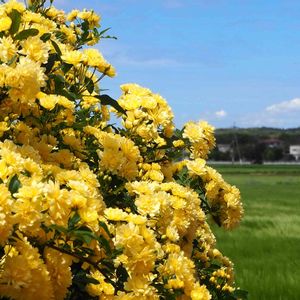 こんにちは〜 今日は青空が綺麗です✨ 黄砂もなく視界良好😃♪ モッコウバラ💛と風になびく麦畑🟩🌿