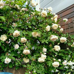 デプレ ア フルール ジョーヌ🌹 南東の角、L字型に誘引しています💕 南側のウッドデッキ 春の剪定&誘引サボったので💦 ある所はワサワサ…またある所は隙間ができました(^o^;) 🌹3