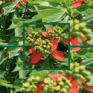 いつもの散歩道‥🚶♀️ 赤色がパッと 目に飛び込んで来ました👀 葉の一部が赤く その中央には 小さな黄色い小花(ピンボケ😅) ショウジョウソウ♪ サマーポインセチアとも 言われています❤️
