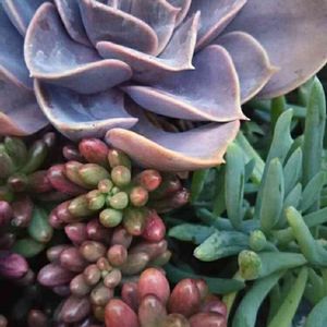 2月の寄せ植え 乙女心、美空の鉾、ピーチプリデ、ゴーラム、十二の巻き、青い渚、あと名無しとか! どーしても乙女心たくさん使いたかった💕 だって、可愛いんだもーん(*//艸//)♡