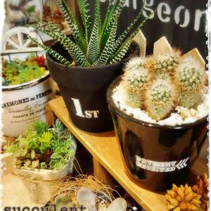 手前のサボテン🌵さん。 陶器の鉢に植えてあって50円👀だったので即買い😁 早速転写シール貼ってみんなの所へ仲間入り~🎶