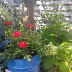 ようやく復活の赤のミニバラ😌🌸💕 つぼみがたくさんついたミニバラを迎えた途端水切れで枯らしてしまっていたのです😭😭😭 青のリメ缶に植えてかえて 嬉しい復活❤