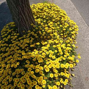 周南市政所にて 等間隔にある木の下にはお花がいっぱいでした