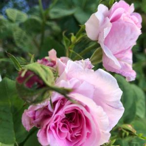 おはようございます☀ リビングの出窓から… 🌹🌿オールドローズ ルイーズオディエ?さん ちょっと開いてきています🤗 こちらは挿し木から2本目の子 やたら蕾がたくさん付いて花びらがクシャクシャしてます💦