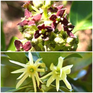 地味系の花を😅 どうも葉がメインになる樹木の花は、ちょい地味〜 上がアオキ、下はシキミです。アオキはゴマ粒みたいで赤黒いし、シキミは葉に紛れて目立ちません😅