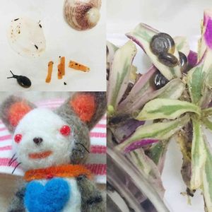 13年前に羊毛フェルトで作った謎の生き物。 配色のセンスがなんだかすごい! 斑入りアラビスの土の中にいたカタツムリの赤ちゃん達! 多分7匹くらいいる気がする✨ そのまんまアラビスも飼育ケースに入れてありまーす✨ これは初日の様子ですね✨