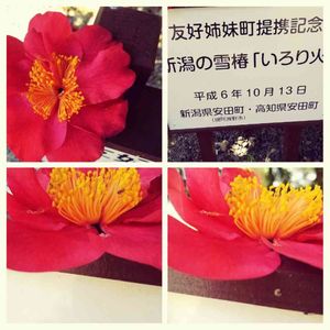 ユキツバキ ツバキ科・属 花糸が橙黃〜黃赤色を帯びる、この花は八重咲きに改良されたものですが原則は変わって無い雪国の様に斜めや寝たりして無いけど南国で生きています。 四国88ヶ所参り27番 神峰寺