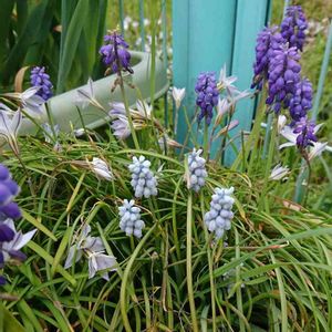道路脇のプランター 誰かが植えておられるの? 放置されてる感もあるあるの… 花ニラとムスカリ咲いてるなぁ むむむ? 中央のムスカリの姿にかなりの違和感 調べたら あった! ムスカリ白😲 これはやや水色っぽいのかな… 初めて見た|゚Д゚))) …