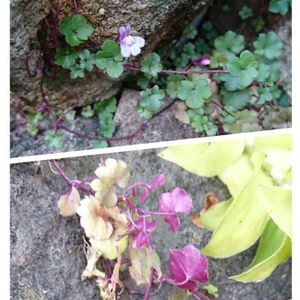 実家の石垣にど根性生えしてる雑草? 小さなお花も可愛いのだけれど 葉っぱが… 表は緑 裏が紫でカッコイイ🐻💕 お名前はなんと…? どなたか教えて下さいませ♥ ※navyさんより「ツタバウンラン」と 教えて頂きました🙇♀️