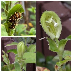 今日のお花 ホトトギス なんですが… 9月某日 友達から ホトトギスの花が咲かないと思ったら 「こんなん居る~~😱」と 見た事もないトゲトゲの虫の写真が届いた! p 「何これ?」 友達 「ルリタテハの幼虫やって」と ふと気になって庭のシロバナホトトギスを 見に行ったら同じの居たぁꕀ⋆😱 で…葉っぱ悲惨に食べられていたので ダメかなぁと諦めかけてたら ↙10月9日 蕾発見‼️ →ところが反対側は…中身が見えてたの えっ⁉️ 半分? どーなってるのー😂⁉️ 次投稿へ続く p
