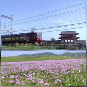 先日 ふらりと奈良へ行って来ました 助手席乗って気楽に…ドライブ 下は京都府内の某田舎の畑風景です 上は4月29日本格デビューの「あをによし」 近鉄奈良線を試験走行中のお姿 奈良平城宮跡 朱雀門と一緒にパチリ 2022年4月22日撮影 p