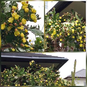 ウチのサボテンと言いたい所ですが… ご近所さん家のお庭のウチワサボテンです🌵 foocoさんに大きくなりますよと お伝えしたので証拠写真です 他所のお宅盗撮容疑をかけられない様に ちゃんとご主人の了解を取って 撮らせて頂きました そしたら また下の写真右にそびえ立つ 別なサボテンにも蕾がついているので そろそろ咲きますと教えて頂いたのですが それは一昨年くらいに朝の6時に見においでと 言われてお邪魔した事があったので 今年は…ゴニョゴニョゴニョ… やんわり遠慮しときました 笑 朝は苦手です p