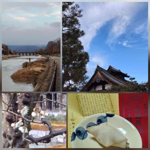 節分の日 京都市内(四条界隈) 特に鴨川から東側は コロナ第一波の時の緊急事態宣言下を 思い出す様なひと気の無さでした 左上 四条大橋 橋下から北を望む 遠くの山に雪が残っているのが見えました 右上 建仁寺本坊の屋根越しの空 左下 建仁寺境内の白梅 右下 節分に戴く 厄除けのお菓子「法螺貝餅」 美味しく戴きました😊 p