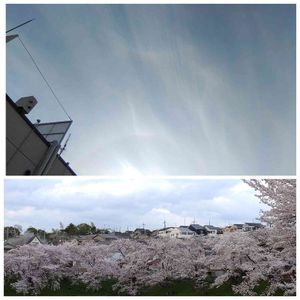 スマホ撮影で厳しいのだけれど… 2022年4月5日 17:12 ハロの上の方に逆さ虹?が見えてたんです うっすら写ってるんですが…見えますか? 下はお散歩中に見付けた桜風景🌸 p