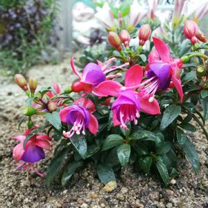 💕イヤリングのようなフクシア💕 【学名】Fuchsia アカバナ科フクシア属 多年草 寒いのも暑いのも苦手 半日陰から日向で育ち春から秋開花 いつも冬に星にしているので 庭で冬越しするガーデンフクシアをお迎えしたので育ててみます❣️ 最高気温22℃最低気温16℃ 曇り時々雨☁️☔️ 今日もゆっくりガーデニング🪴 雨の好きな子は外に出し 蒸れに弱い子は軒下へ避難♥️