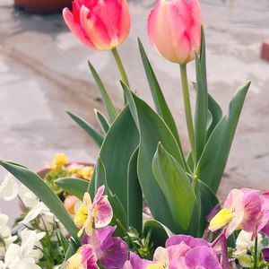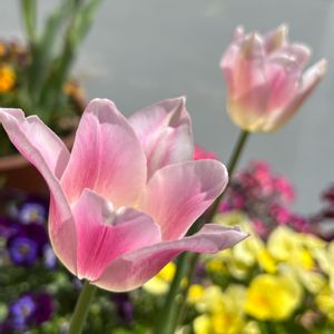 こちらのビオラの鉢の中には、ピンク色の花のチューリップ 「ジュディスレイター」が入っています🌷 パステルカラーのビオラは、徒長しやすいのか少しノビノビしています。