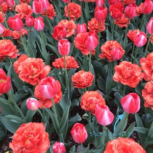 昭和記念公園のチューリップガーデン 様々な見せ方をして同じ赤でも八重咲きのリメリックと二色咲きのジュディスレイスターが一緒になっている。