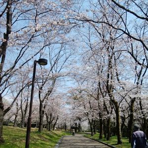 昨日の公園 染井吉野と若葉と薔薇の若芽のトリプルです 市花の薔薇🌹も見事な公園です