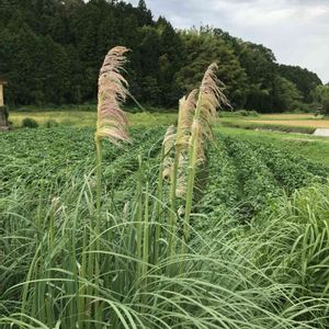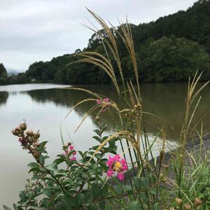 雨降りばかり☔️ 昨夜もよく降りました ススキを見ると秋を感じます ため池のコンクリートの所に百日紅が咲いていました🌸 種が運ばれて来たようです😊