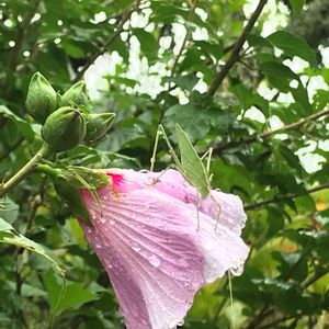 朝から庭に出ていると高い所にウマオイムシかなぁ 木槿の花に止まっていました😊