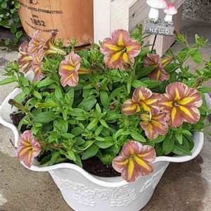 サフィニアアートの新作❓ 『とらねこ』に一目惚れし、連れて帰ってきました💕 こんな模様見たことないです。 お花が咲いたから、カットしてモリモリに‼️ なるかしら… いつも伸び伸びにしてしまいます💦