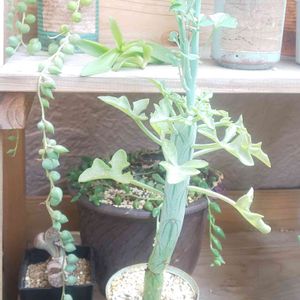 七宝樹 2年位前におむかえした子です。 昨年の梅雨明け根元の一節が腐り やべ〜と思い その一節をのけて、 その一節の上は二股に別れてたので1つは寄せ植えに もう1つは( ˙▿˙ )☝これ。 寄せ植えはずっとお外 現在坊主で葉っぱ1枚もない(笑) こちらはベランダの 明るい日陰 葉っぱ沢山フサフサやなぁ