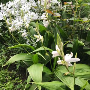 ホワイトコーナーの 斑入り白花シランと ツルハナシノブ(這性フロックス)