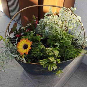 1月に作った寄植え。主役のラナンキュラスは2月に雪で花と蕾が全滅し、もうだめかと思っていたら、まだ生きていて再び蕾をつけてくれました😳 オステオスペルマムが大きくなり花をたくさんつけている影に小さく蕾が見えます。 そこで、オステオスペルマムとネメシアは花壇にお引越し。 寄植えを作り直すことにしました。 新たにワーレンベルギアアリスブルーとアカエナパープレアを植えてみました。 なんだか寂しい寄植えになってしまいましたが、ラナンキュラスが咲いてくれてくれたら豪華になるかな?😅